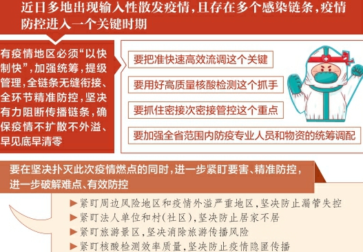 林武指出,我省疫情防控在经历较长时间平稳阶段后,近日多地出现输入性散发疫情,且存在多个感染链条,疫情防控进入一个关键时期。有疫情地区必须用好“以快制快”这个应对奥密克戎毒株传播最关键最核心的手段,加强统筹,提级管理,推动核酸检测、流调筛查、隔离转运、医疗救治、社会面管控等全链条无缝衔接、全环节精准防控,坚决有力阻断传播链条,确保疫情不扩散不外溢、早见底早清零。要把准快速高效流调这个关键,整合省市县资源力量,综合运用大数据、互联网等手段开展流调溯源,以最快速度实现对风险人员的管控。要用好高质量核酸检测这个抓手,聚焦重点区域和人群,优化检测策略,加密筛查频次,尽快把风险人员全部排查出来。要抓住密接次密接管控这个重点,在快速隔离转运的基础上,抓好集中隔离点的规范管理,坚决防止出现隔离点内交叉感染。要加强全省范围内防疫专业人员和物资的统筹调配,确保力量充足,努力在最小范围最短时间用最低成本扑灭疫情燃点。